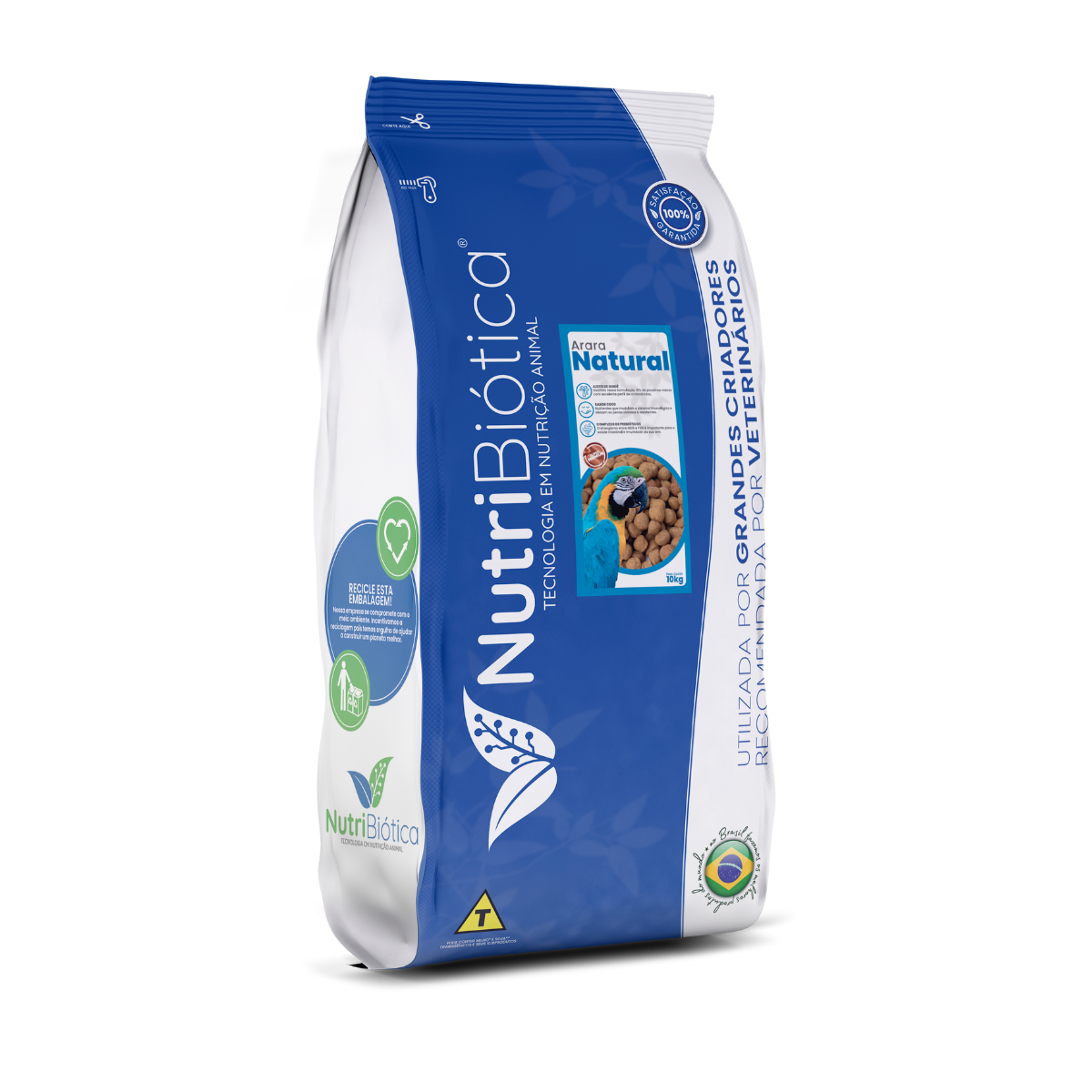 A Nutribiótica Arara Super Premium é um alimento completo e balanceado para psitacídeos de médio e grande porte que possuem o hábito alimentar de consumir sementes oleaginosas. Embalagens plásticas com barreira luz e oxigênio de 10kg.